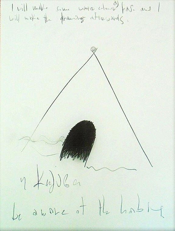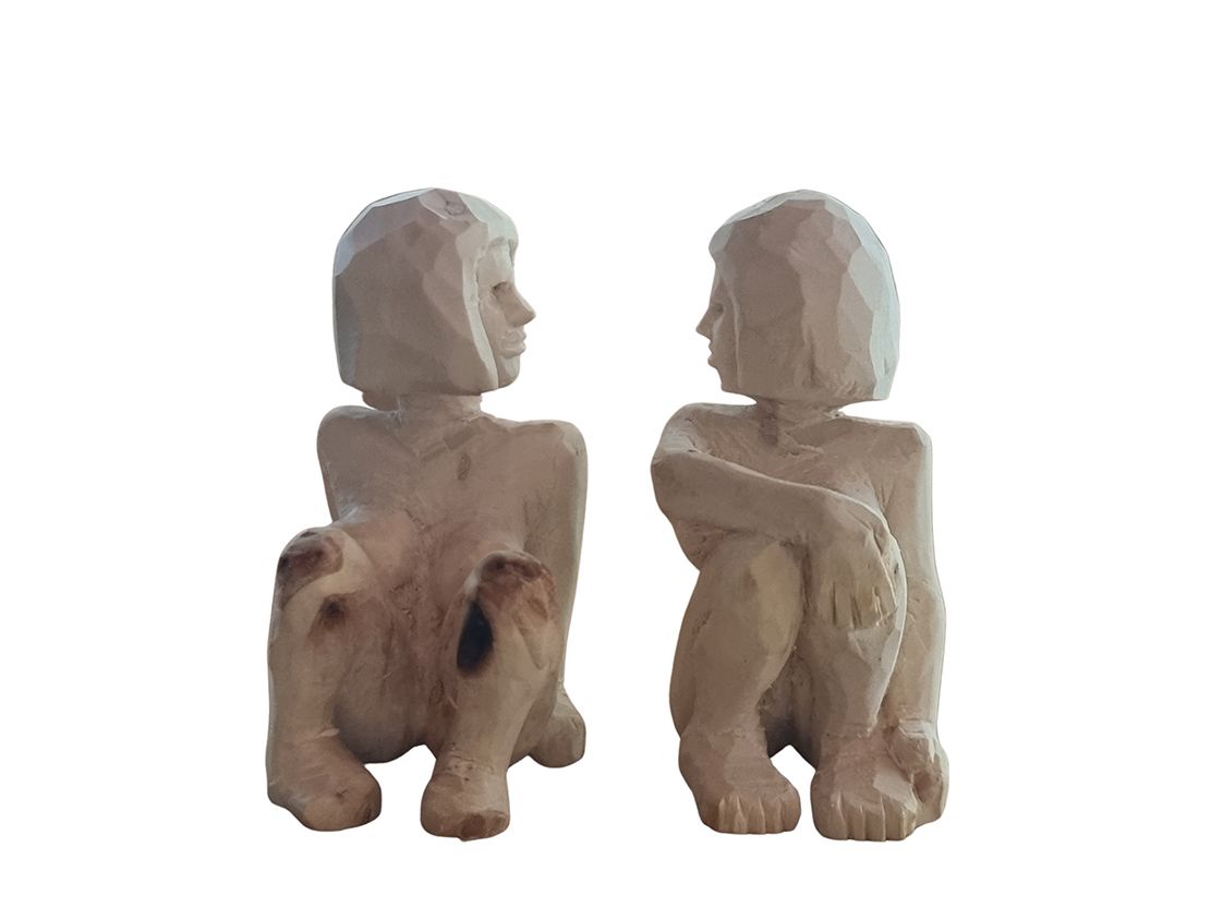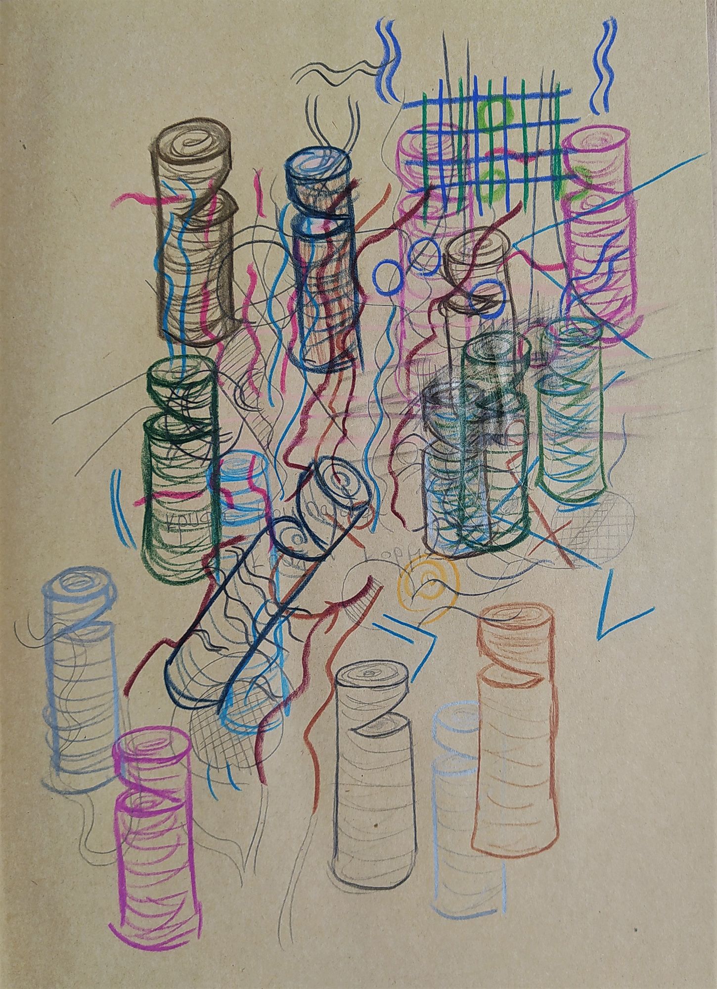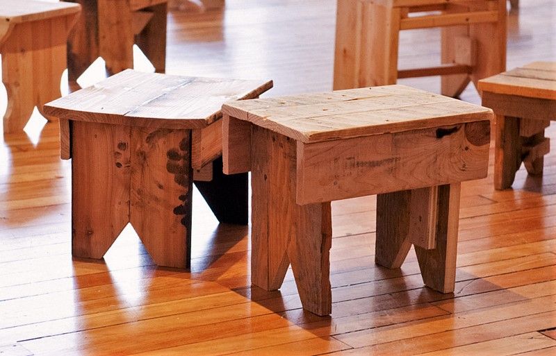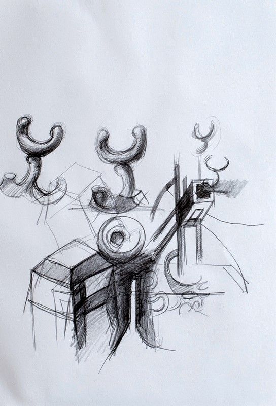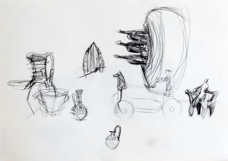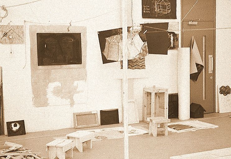 Thesis: Travelling Talismans (Thesis & Artistic project: Installation of wooden sculptures (stools), drawings and mixed media collage-paintings).